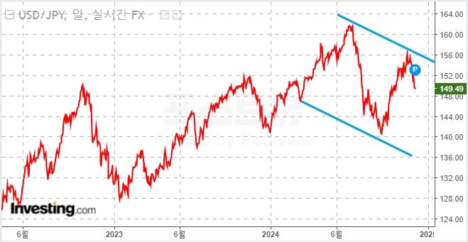 최근에 달러당 150엔을 넘어서던 엔화가치가 149엔대로 내려왔습니다