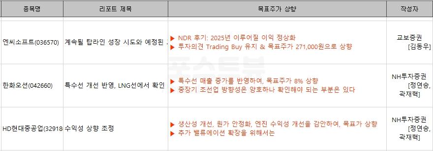 엔씨소프트, 한화오션, HD현대중공업이 목표주가가 상향되었습니다