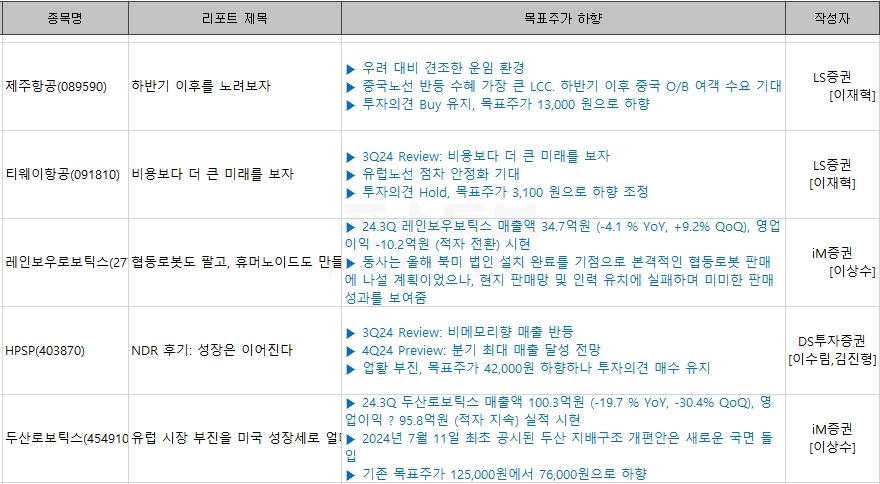 항공 관련주와 로봇관련주 각각 2종목이 목표가가 하향되었습니다