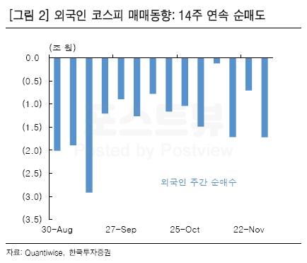 외국인의 코스피 연속 순매도가 14주 동안 진행되고 있습니다