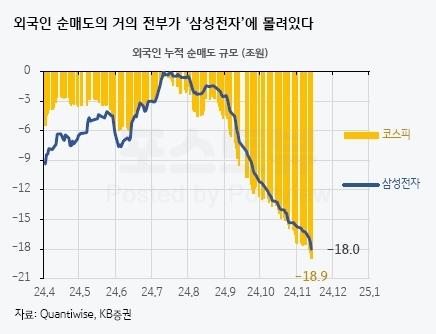 이러한 외국인의 코스피 순매도는 삼성전자에 올인되고 있는 상황입니다