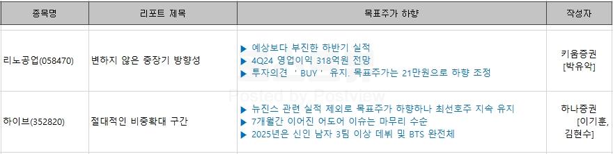 리노공업과 하이브가 부진한 실적과 뉴진스 관련 내용으로 목표주가가 내려간 모습입니다