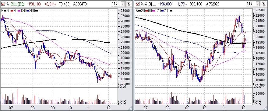 리노공업 주가를 보면 반도체 장비 종목들의 주가하락이 그대로 보여지고 있습니다