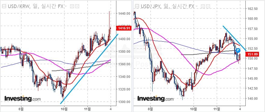 국회에서 계엄령 해제가 통과되는 순간부터 안정되면서 1410원대로 떨어졌습니다