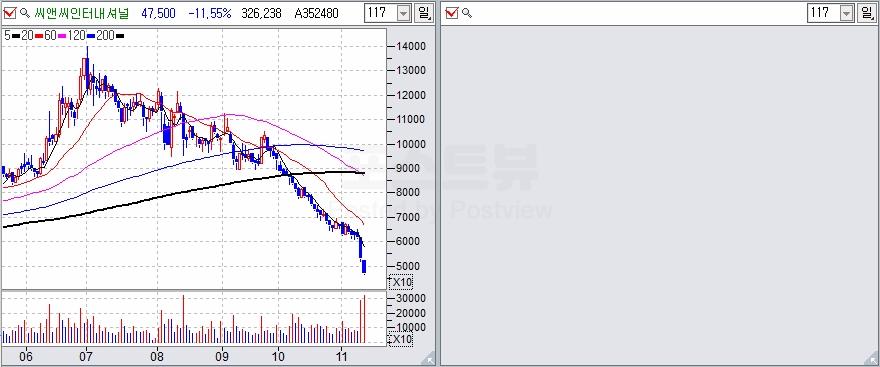 주식사장 흐름이 워낙 좋지 않다보니 주가는 하락하는 흐름입니다