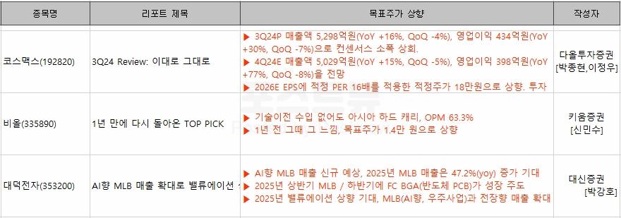 오늘 증권사 목표주가 상향 종목은 코스맥스, 비올, 대덕전자가 되겠습니다