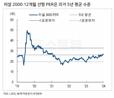 12개월 선행 PER 기준으로 5년 평균수준이라서 러셀2000 주가 전망을 밝게 보여줍니다