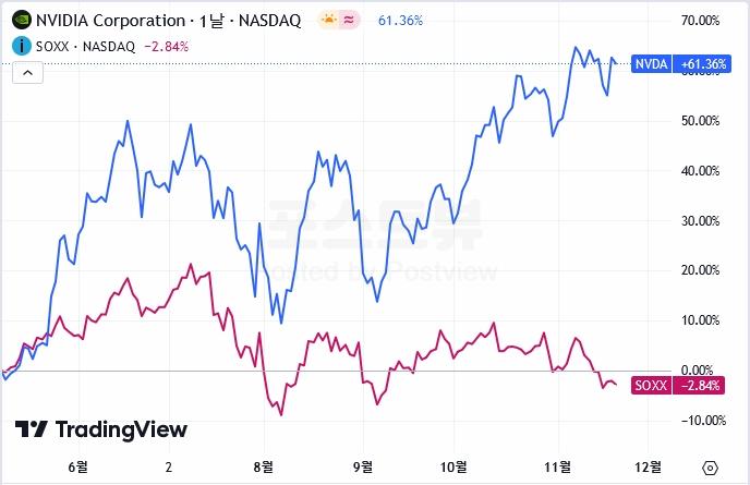 아래 차트는 엔비디아 차트와 필라델피아 반도체 지수의 비교모습입니다