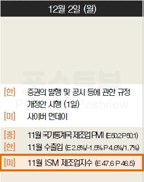 12월 2일 월요일에는 미국 11월 ISM 제조업 지수가 발표됩니다