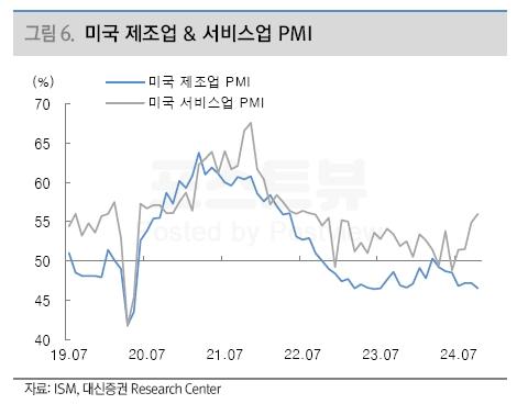 ISM 서비스업 지수가 50 이상의 수치를 보여주면서 상승하는 반면에