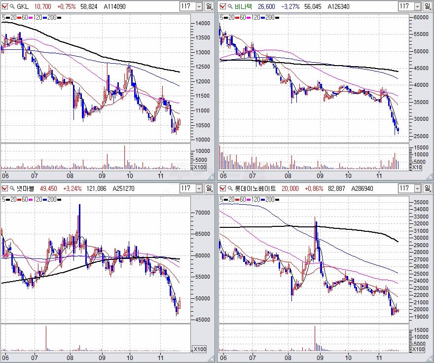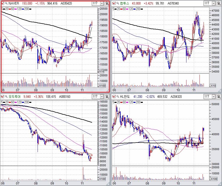네이버, 더존비즈온, 컴투스 등의 종목들이 차트가 좋은 흐름을 보여주고 있습니다