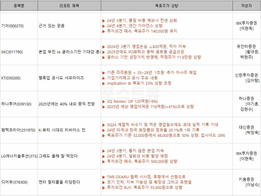 11월 6일 국내 증권사 리포트에서 목표주가를 상향한 종목들을 정리했습니다