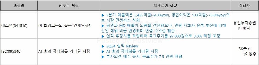 오늘은 2개 기업만 목표가가 하향된 모습인데, 에스엠과 ISC가 되겠습니다