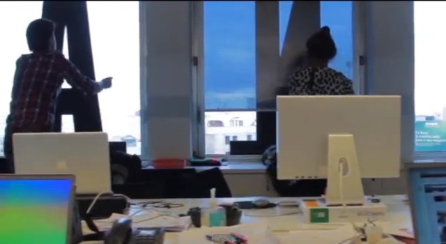 직원들이 해당 텍스트를 설치한 후에 파란색 커튼을 이용해서 부각시키는 모습입니다. 낮에는 파란 커튼을 이용하고 밤에는 사무실의 조명을 이용해서 텍스트를 도드라지게 표현합니다.