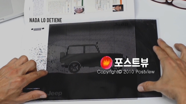 잡지의 제한적인 지면을 이용해서 움직이는 지프자동차를 연출한 점이 재미있는데요~