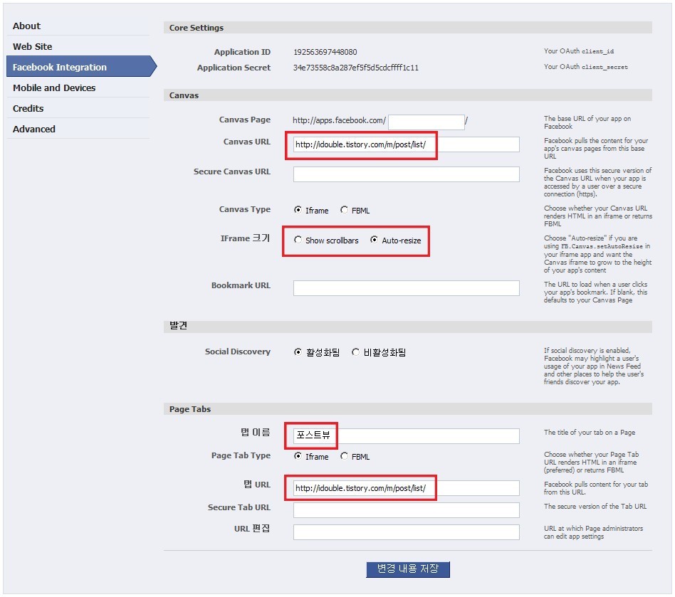 페이스북 개발자 페이지에 “포스트뷰” iFrame 어플리케이션이 설치된 모습입니다.