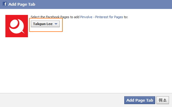 위의 그림처럼 자신이 설치하려고 하는 페이지를 선택한 후에 “Add Page Tab” 버튼을 클릭해주세요.
