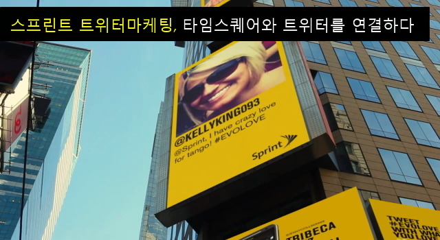 미국 이동통신업체 “스프린트” 에서 진행한 트위터마케팅 사례를 소개합니다. 해쉬태그 “EVOLOVE” 를 활용해서 뉴욕 타임스퀘어 광장의 전광판에 프로필 이미지와 트윗내용을 소개하는 이벤트 입니다.